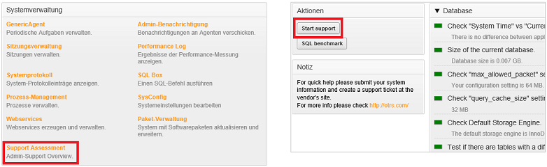 In OTRS 3.2 und älteren Versionen ist die Funktion im Admin-Bereich über „Support Assessment“ zu erreichen. Hier wurde sie noch als vorinstalliertes Paket eingebaut.