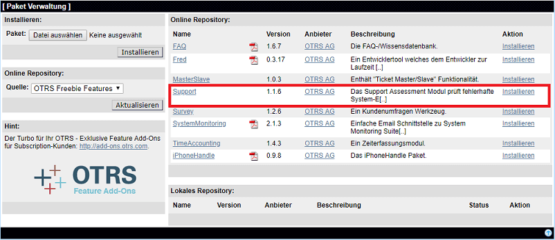 Sollte „Support Assessment“ im Admin-Bereich nicht zu finden sein, muss es über die Paketverwaltung aus den kostenlosen OTRS Paketen installiert werden. Der Name des Pakets ist dann „Support“.