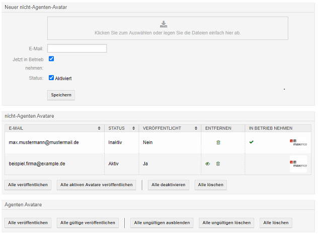 Das Avatar-Management befindet sich im Adminbereich. Dieses ermöglicht das Hochladen und Zuteilen eines Avatars zu einer Email Adresse.