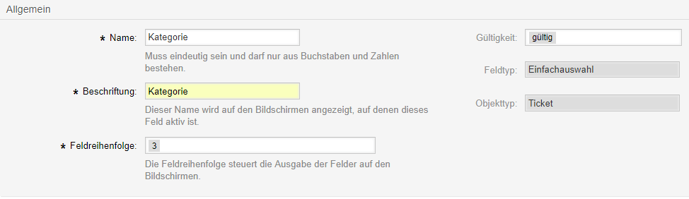 Es öffnet sich ein neues Fenster. Hier müssen Sie einen Namen und eine Beschriftung eingeben. Der Name wird intern von OTRS genutzt, die Beschriftung ist der Teil, den der Kunde als Bezeichnung für das Feld später angezeigt bekommt. Der Übersichtlichkeit halber gebe ich hier beidem die gleiche Bezeichnung.