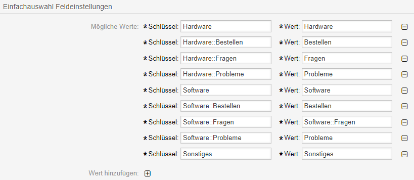 Unter „Einfachauswahl Feldeinstellungen“ müssen für jede Kategorie die Werte angegeben werden. Klicken Sie dazu auf das Pluszeichen hinter „Wert hinzufügen“.