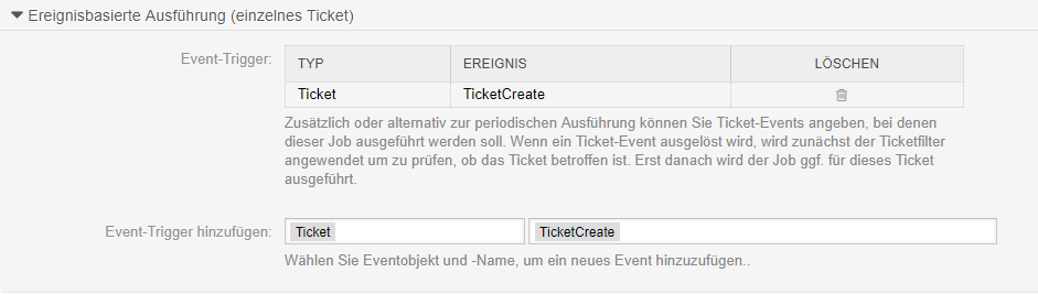 Klicken Sie auf den Punkt „Ereignisbasierte Ausführung (einzelnes Ticket)“ und fügen Sie einen Event-Trigger hinzu. Dazu wählen Sie „Ticket“ als Eventobjekt (linkes Feld) und „TicketCreate“ als Event (rechtes Feld).