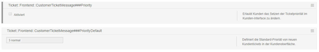 Standardmäßig hat der Kunde im Kunden-Frontend die Möglichkeit eine Priorität für das Ticket zu wählen. Das können Sie ebenfalls in der Systemkonfiguration abschalten. Suchen Sie dazu nach „Ticket::Frontend::CustomerTicketMessage###Priority“. Hier haben Sie die Möglichkeit das Feld zu deaktivieren und gegebenenfalls die Standard-Priorität zu ändern.