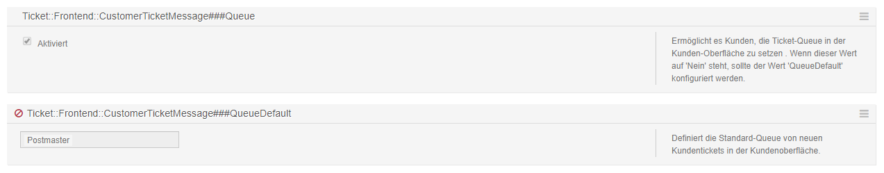 Um das Feld für die direkte Auswahl der Queue auszublenden gehen Sie zurück zum Suchfeld und suchen Sie dort nach „Ticket::Frontend::CustomerTicketMessage###Queue“. Hier bekommen Sie zwei Felder angezeigt. Entfernen Sie im ersten Feld den Haken bei „Aktiviert“ und speichern Sie die Einstellung. Dadurch wird die Queue-Auswahl im Kunden-Frontend ausgeblendet. Im zweiten Feld kann die Standard-Queue ausgewählt werden. Hier landen Tickets, die nicht durch einen GenericAgent in eine andere Queue verschoben worden sind.