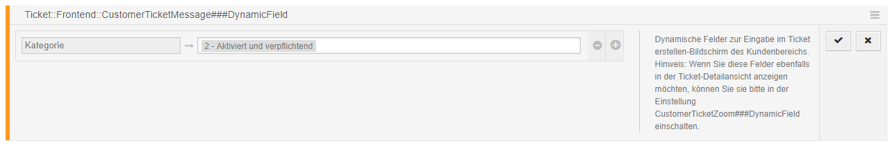 Um das dynamische Feld ein- und die vorherige Queue-Auswahl auszublenden müssen Sie Einstellungen in der Systemkonfiguration anpassen. Gehen Sie dazu im Admin-Bereich zur Kategorie „Administration“ und klicken Sie dort auf „Systemkonfiguration“. Geben Sie im Suchfeld auf der neuen Seite „Ticket::Frontend::CustomerTicketMessage###DynamicField“ ein. Sie bekommen dann ein Feld angezeigt in dem Sie den Namen den dynamischen Feldes eintragen müssen. Klicken Sie dazu auf das Plus-Zeichen. Anschließend bekommen Sie eine neue Auswahl angezeigt um das dynamische Feld zu aktivieren. Wählen Sie hier „Aktiviert und verpflichtend“. Um Einstellungen in der Systemkonfiguration zu speichern klicken Sie auf der rechten Seite auf den Haken.